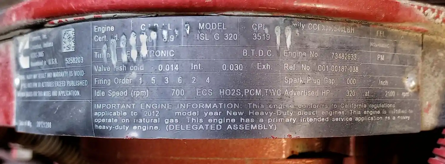 Cummins ISL G CM2180, 320 HP, Core Engine, ESN 73482633, CPL 3519, DOM 12/7/2012. Locked Up