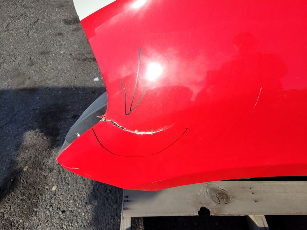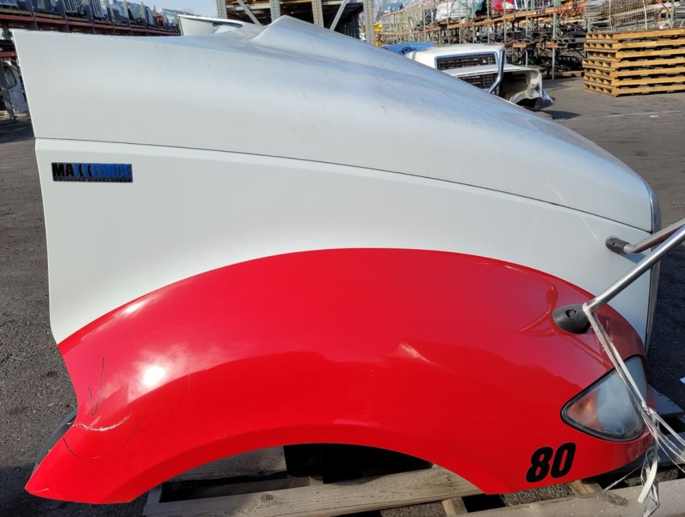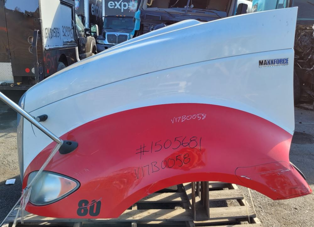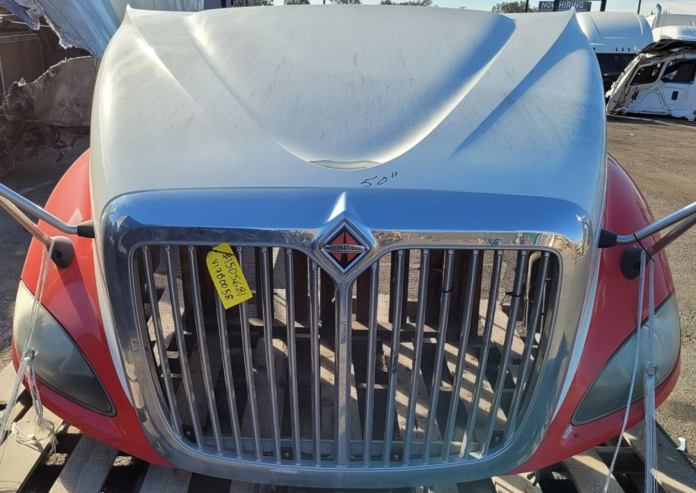 2013 International ProStar Hood, 56"L, P/N 3858844C91, 3858844C92. Chip Near Left Headlight; Scratch/Crack On Left Fender; Crack Right Rear Of Fender. Repairable For Reuse.